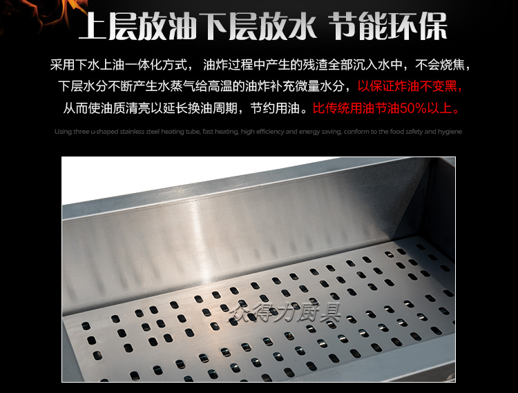 眾得力旗下產品油炸系列,不銹鋼電熱節能油水分離油炸爐,油炸機,YZ系列油炸爐,電加熱,節能油水分離油炸一體爐,油水過濾,確保油炸物能100%油炸,殘留物通過水過濾,拒絕一直油炸。油炸不變黑,炸出來的食品外形美觀