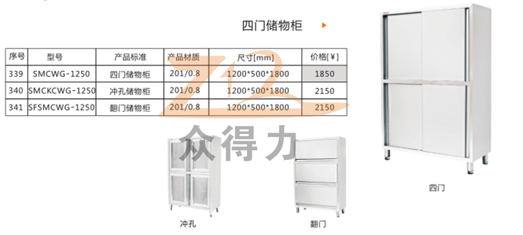 江西眾得力廚具有限公司生產(chǎn)銷售食品機(jī)械和商用廚具系列設(shè)備,為您提供中央廚房整體解決方案。本產(chǎn)品為四門儲物柜系列,有沖孔、翻門 四門之分,均為四層儲物柜系列。